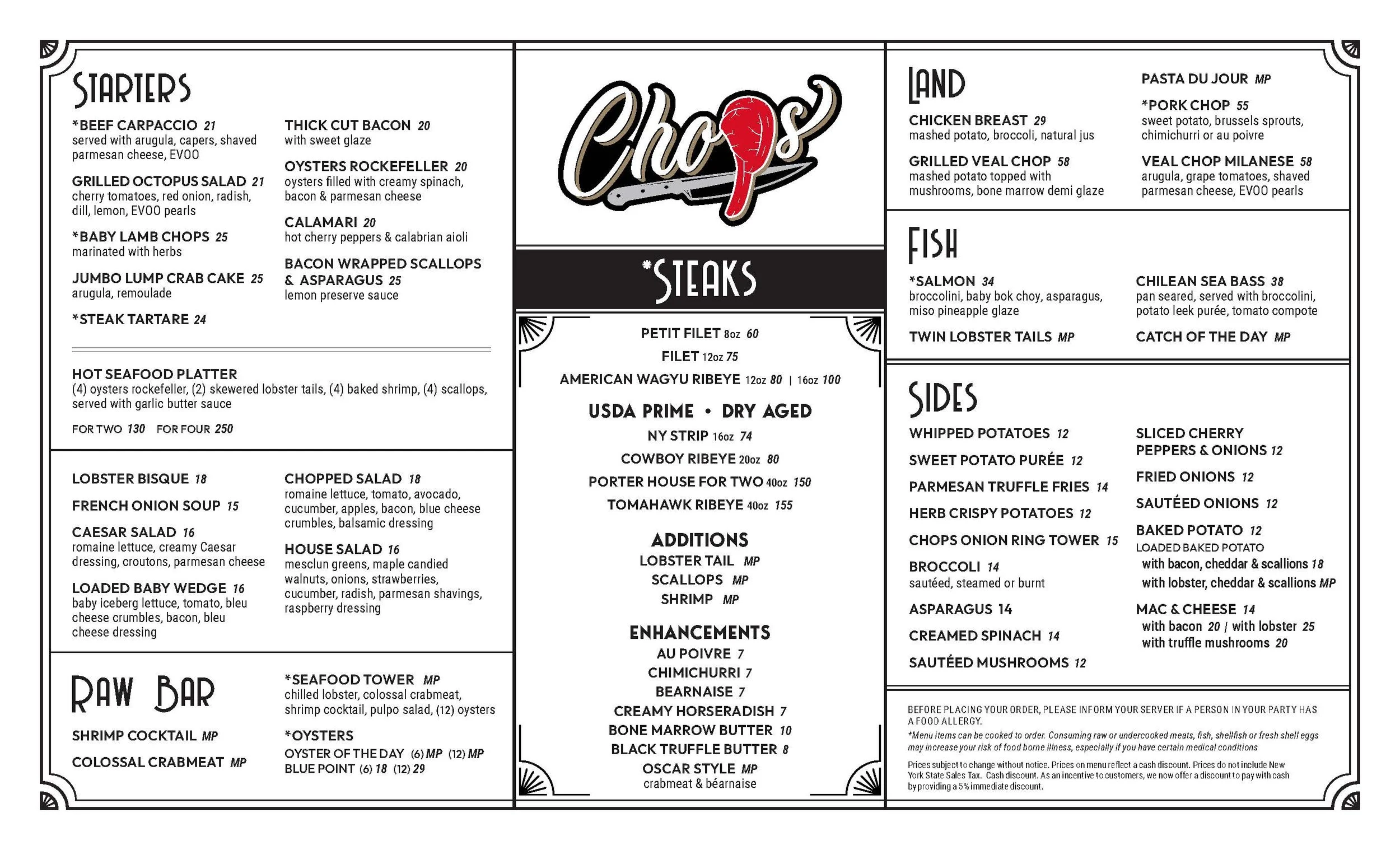 Chops Steakhouse in Patchogue offers a menu crafted for steak lovers and food enthusiasts alike, featuring prime cuts of beef, fresh seafood, and elevated American classics. With carefully curated sides, appetizers, and signature dishes, every meal is designed to deliver a memorable dining experience in a warm, inviting atmosphere.