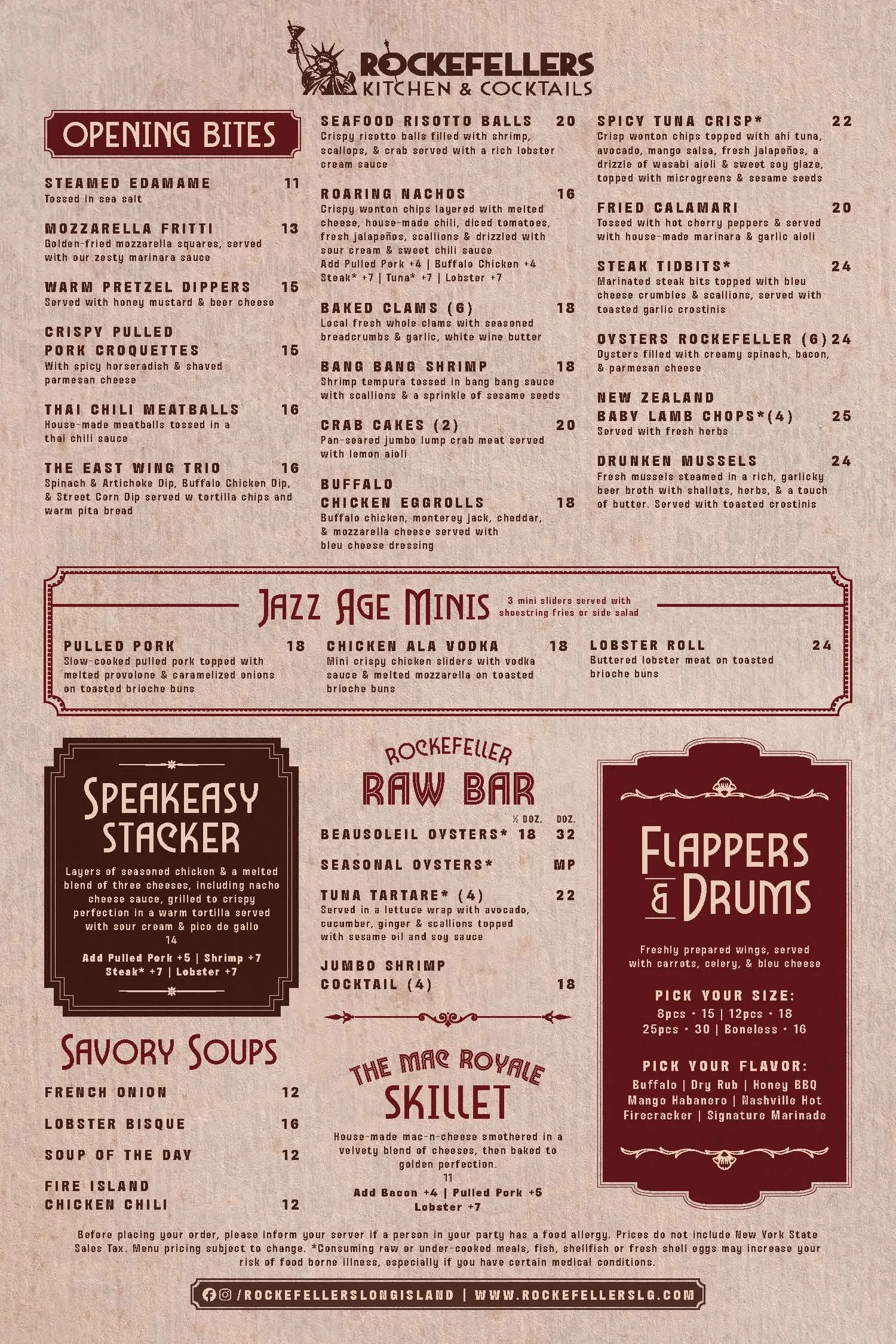 Rockefellers Kitchen & Cocktails in Lake Grove is a full-service restaurant offering a blend of classic American cuisine with modern touches in a stylish, Gatsby-inspired setting. Known for its mix of comfort favorites, fresh seafood options, and elevated cocktails, it’s designed to be a welcoming spot for everything from casual dinners to nights out and special occasions.